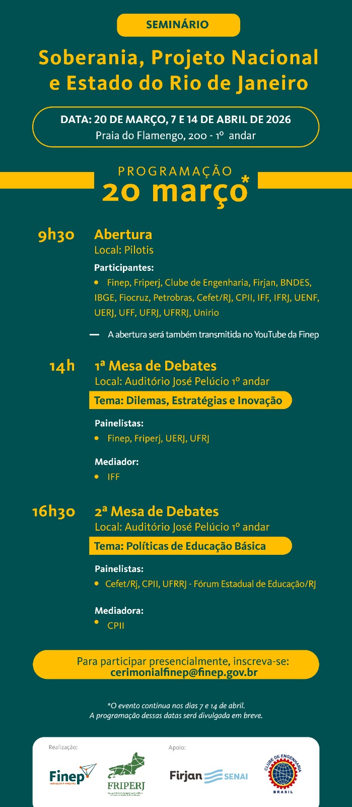 O seminário conta com o apoio da Federação das Indústrias do Estado do Rio de Janeiro (FIRJAN) e do Clube de Engenharia. Com o objetivo de contribuir para a ampliação e sistematização da reflexão regional no estado do Rio, aprofundando discussões e propostas para o desenvolvimento do estado.