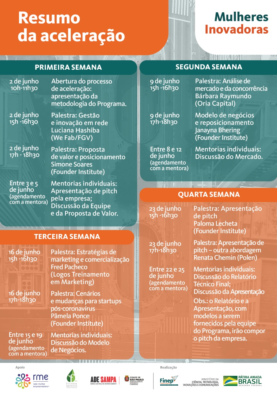 Serão agendadas reuniões de mentoria e palestras a cada semana. Após este processo de aceleração, as startups se apresentam para a Banca Avaliadora – de 14 a 16/07 – de onde sairão as premiadas.